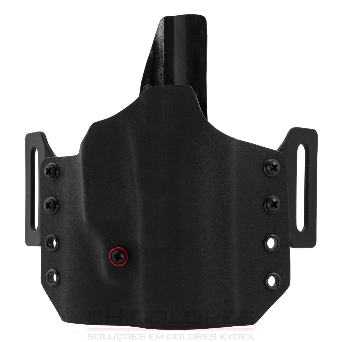 Fabricado em kydex de 2mm de alta resistência a temperatura, utiliza parafusos inoxidáveis e passa cintos de 1,75”, os quais aumentam a estabilidade do equipamento na cintura (instalado de forma a não reduzir a vida útil do equipamento). Possui ajuste de altura, ajuste fino de retenção da arma para uma melhor adaptação do portador com seu equipamento.