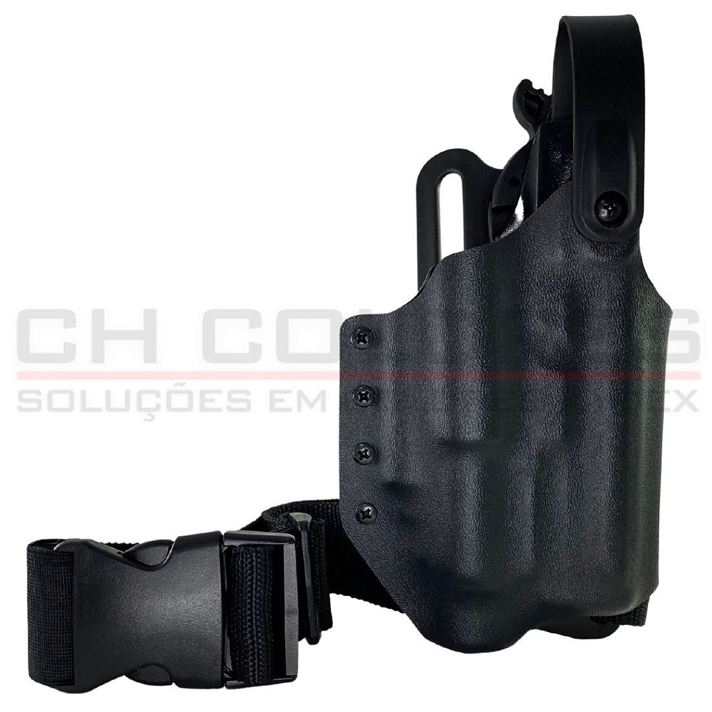 Fabricado em kydex de 2 mm de alta resistência a temperatura, utiliza parafusos inoxidáveis em todo seu conjunto, dois (02) níveis de retenção da arma, pressão ajustável e cinta de abertura automática, dropset lateral e faixa de perna ajustável. Modelo ideal para o uso em competições com deslocamento e em serviços ostensivos de segurança.